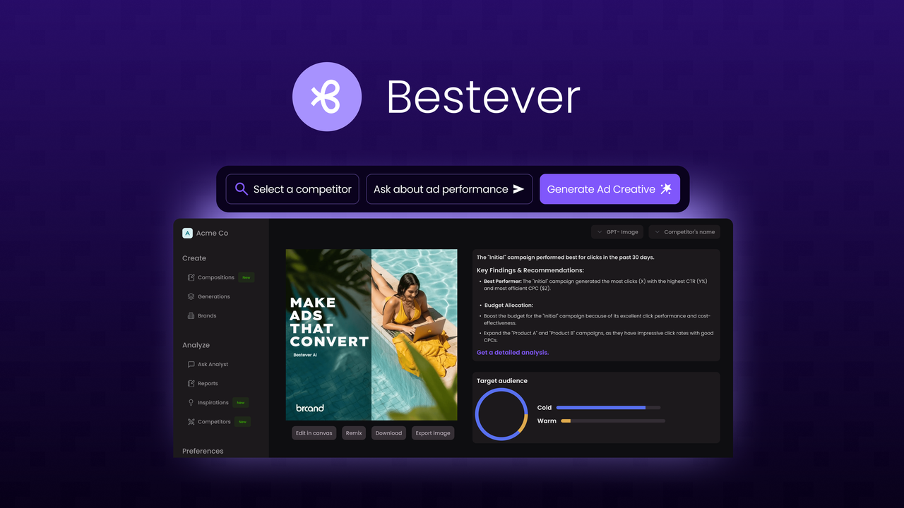 Đó là chưa kể, trong nhiều trường hợp, việc tìm đến các đơn vị thiết kế hay agency bên ngoài không chỉ tiêu tốn một khoản ngân sách không nhỏ mà còn có thể làm chậm trễ tiến độ cập nhật chiến dịch. Chính vì vậy, việc tự động hóa quá trình sáng tạo và phân tích quảng cáo đã trở thành một nhu cầu gần như tất yếu. Và đó là lý do hôm nay mình muốn giới thiệu đến bạn Bestever — một nền tảng đột phá giúp bạn kiến tạo những chiến dịch quảng cáo hiệu quả vượt trội mà không đòi hỏi kỹ năng thiết kế chuyên sâu.