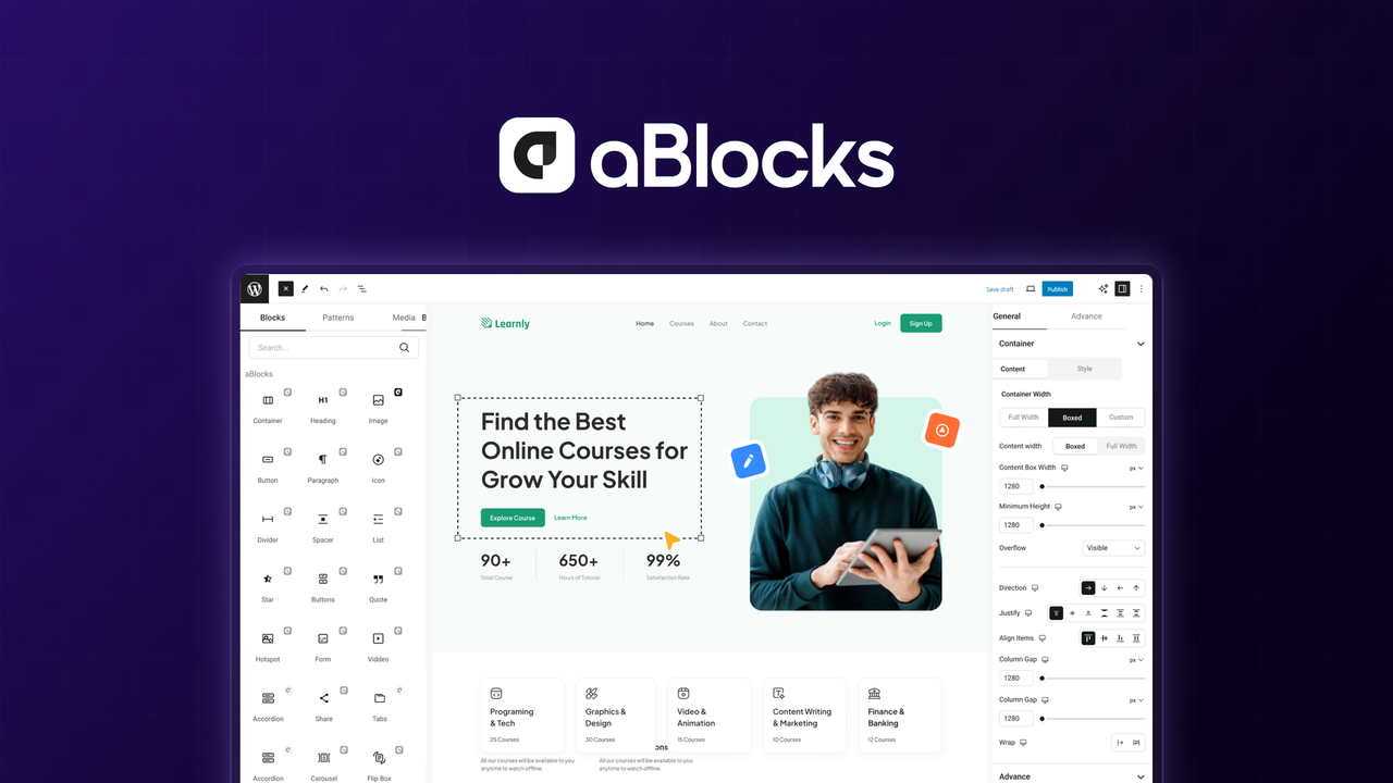 Thiết kế website trực quan: aBlocks cung cấp hơn 70 khối Gutenberg, 359 mẫu bố cục và 267 trang dựng sẵn. Bạn chỉ cần chọn, kéo thả và tinh chỉnh là có ngay giao diện hoàn chỉnh.